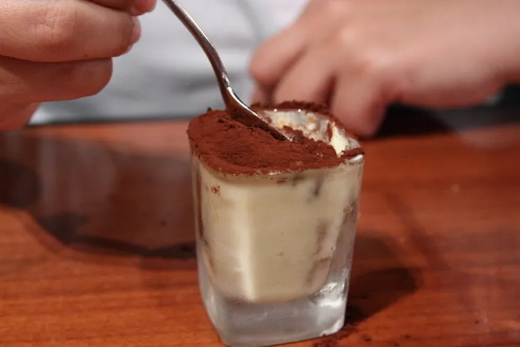 The intention of this drink is to make a shot that was flavored to resemble a liquid version of the tiramisu desert as served at Bruno’s Ristorante in Cleveland, Ohio. While the cocoa powder is listed as a garnish, it is important for the overall flavor – Hint: Don’t breath in while drinking or you will choke on the powder! This will make about three, one ounce shots.